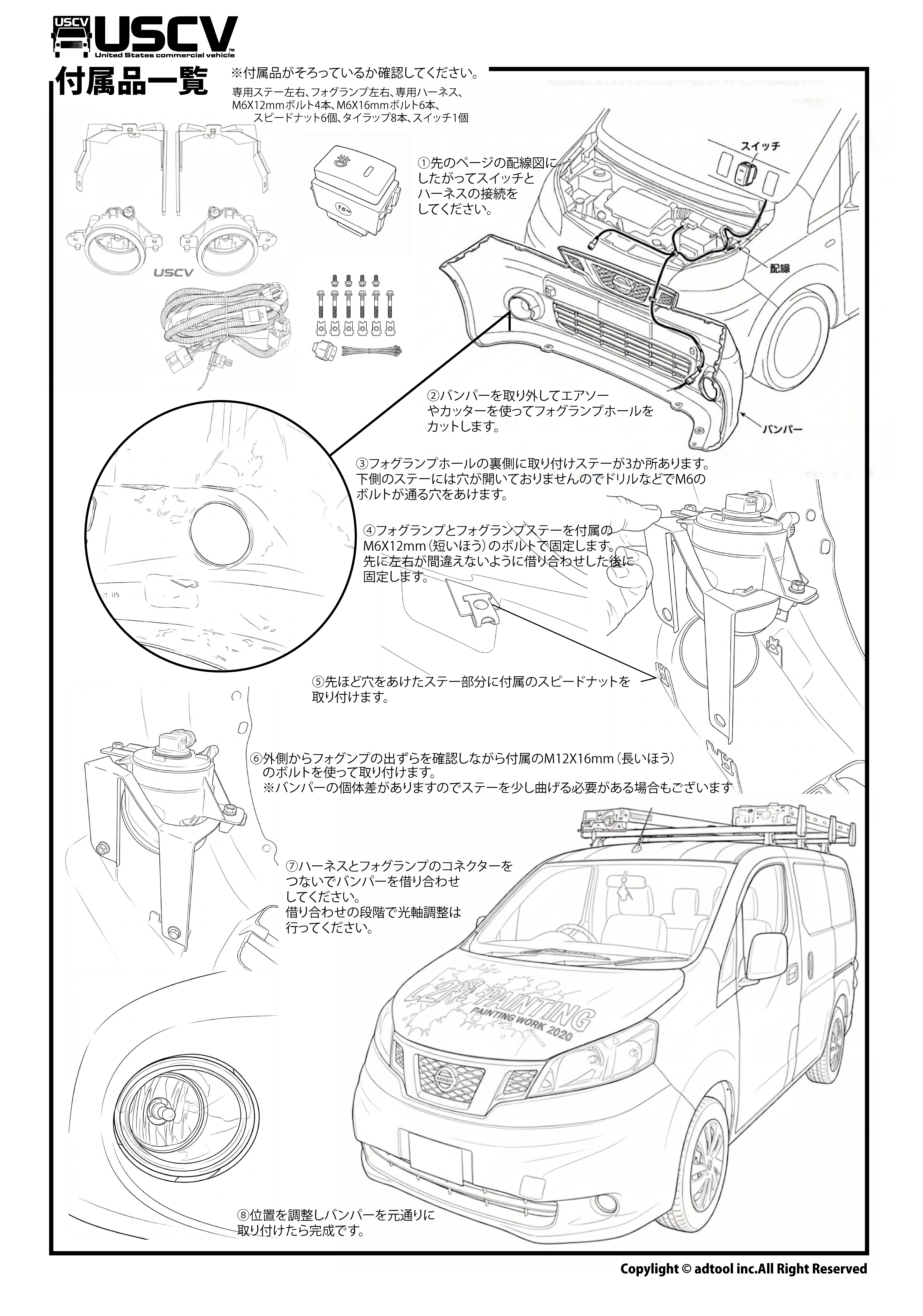 これからは安心です。このKITは、NV200バンパーにぴったりのサイズ感で設計されており、取り付けもスムーズです。ただし、国内仕様の車両には取り付けできませんので、ご注意ください。商品には必要な取り付け部品が含まれており(FOGLAMP本体、専用取り付けステー、ハーネスセット、スイッチ、スピードナット、ボルトなど)、DIY初心者でも簡単に取り扱えます。